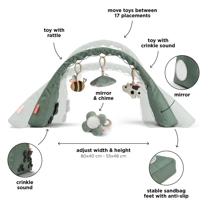 Kjo palestër aktivitetesh e gjelbër inkurajon koordinimin, ndërton forcën dhe mbështet eksplorimin e hershëm shqisor të foshnjës suaj dhe mund të përdoret në një dyshek lojërash, mbi një fole komode ose kudo që fëmija juaj pëlqen të luajë.
