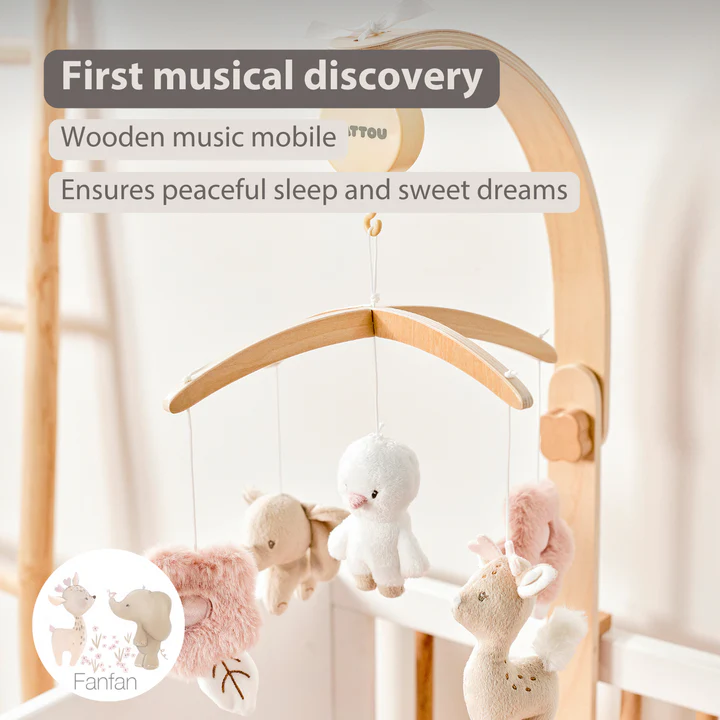 Lëvizës muzikor prej druri me kafshë pelushi që rrotullohen dhe një melodi të butë "Le-La-Lu".