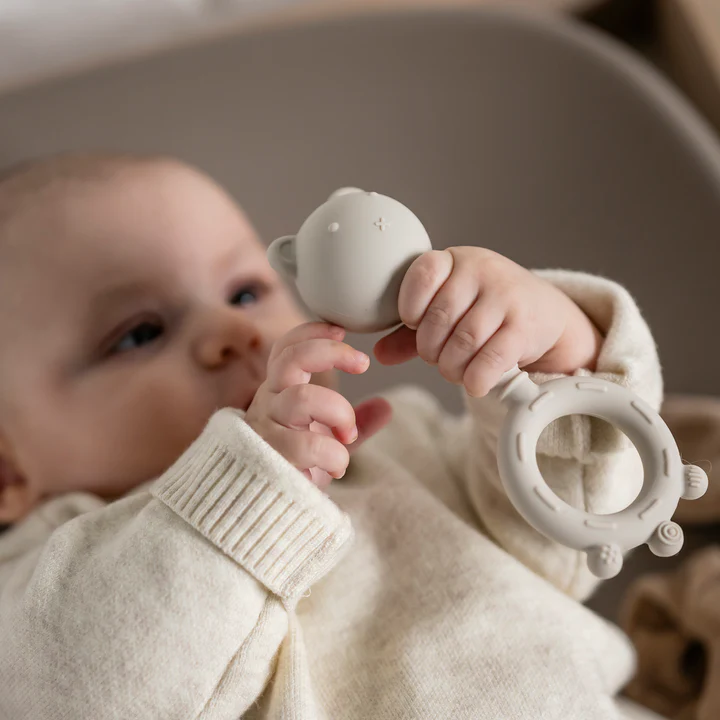 Një ari silikoni që është i lehtë për t'u kapur nga duart e vogla të foshnjës - një lodër argëtuese ideale për lëvizje.