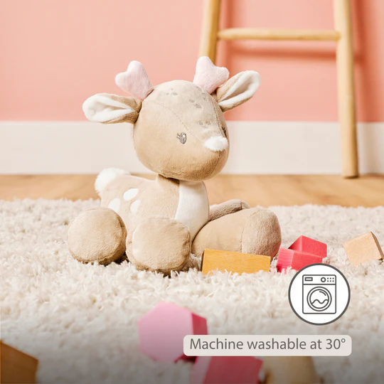 Ky pelush i adhurueshëm në formën e një dreri të vogël do të bëhet shpejt miku më i mirë i foshnjës suaj. Veluri i butë e bën të papërmbajtshëm për t'u përqafuar dhe mbajtur. Falë shumë opsioneve të kapjes - nga këmbët deri te veshët - shqisa e prekjes dhe aftësitë motorike të imëta të fëmijës suaj stimulohen në mënyrë të gjallë. Me pamjen e tij miqësore dhe ngjyrat e buta, ky dre nuk është vetëm shoku i përsosur i lojës për aventura dhe momente përkëdheljeje, por edhe një tërheqës i bukur në dhomën e fëmijëve. Një pelush që ofron rehati në momente të vështira, duke ofruar njëkohësisht gëzim të pafund.