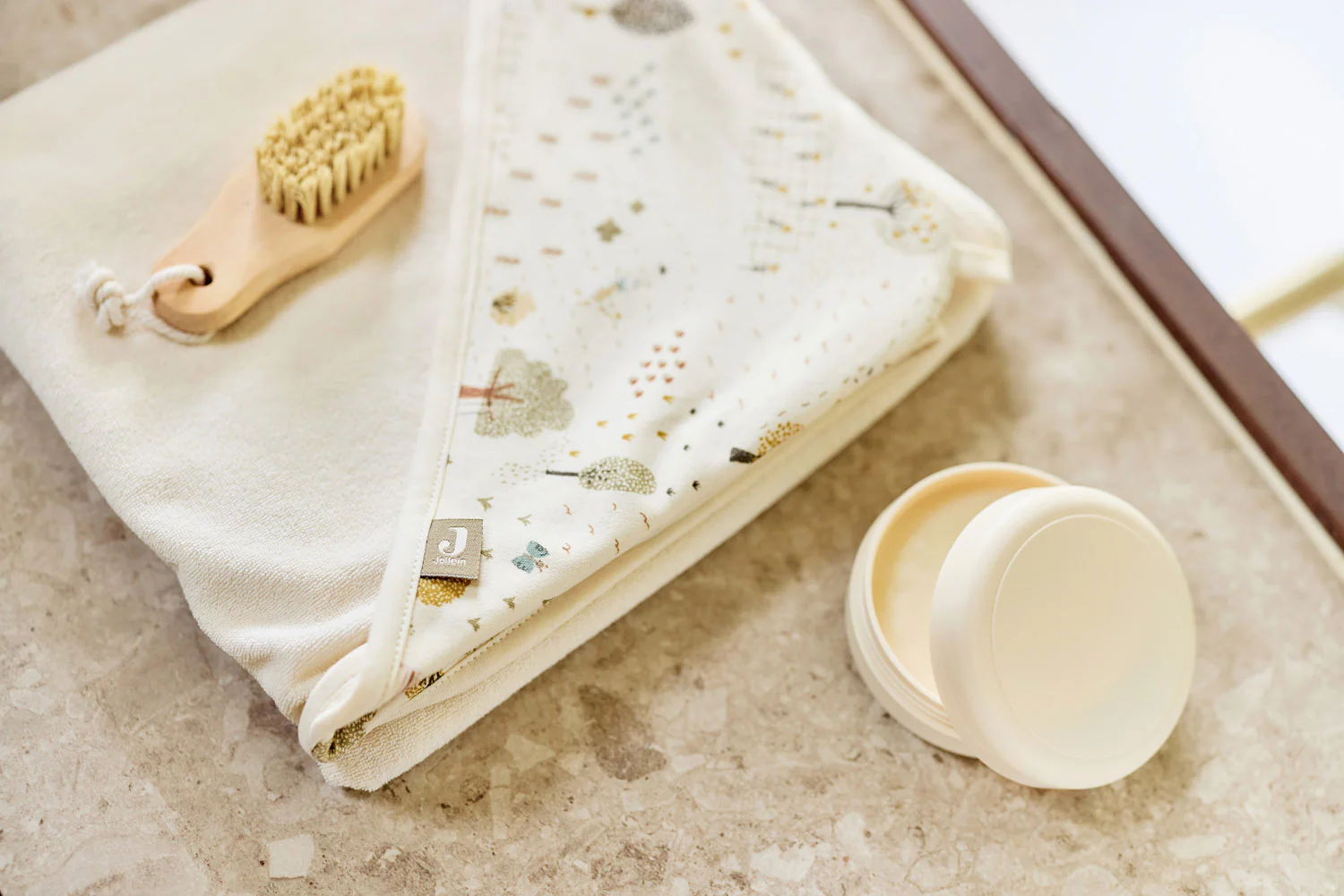 Ky peshqir e butë për banjo është perfekte për të tharë të voglin tuaj pas banjës. Shtresa e jashtme është bërë prej xhersi të butë me një printim të lezetshëm të Tiny Park në të gjithë sipërfaqen, ndërsa pjesa e brendshme është e veshur me një copë terry ultra të butë me ngjyrë tërshëre për më shumë rehati. Madhësia 75x75 cm e bën atë perfekte për të mbështjellë foshnjën tuaj pas një banje të ngrohtë!