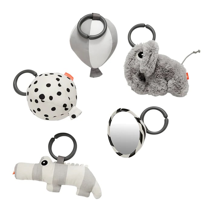 Varni lodrat në 13 pozicione të ndryshme në harqe. Croco do të kërcasë kur të preket, Elphee do të kërcasë, pasqyra e vogël do të buzëqeshë përsëri dhe tullumbacet përmbajnë një zile dhe një zile - të gjitha për stimulimin e foshnjës suaj. Dysheme e mbushur me jorgan: mund të lahet në 40°C. Mos e thani në tharëse. Dysheme loje: 100% poliester. Lodra: Materiali: 80% pambuk 20% poliester. Mbushja: 100% fibra poliesteri (të ricikluara). Mbushja e kësaj lodre është bërë nga material i ricikluar nga një strukturë e çertifikuar nga GRS.