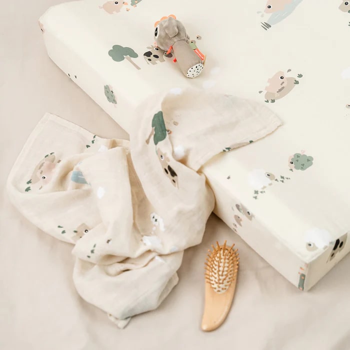 Ky dyshek i këndshëm për ndërrimin e rrobave ofron një vend të rehatshëm dhe të sigurt për të voglin tuaj. Mbushja e butë siguron një sipërfaqe komode, ndërsa anët e ngritura ndihmojnë në parandalimin e lëvizjes së foshnjës. Me një sipërfaqe rezistente ndaj ujit që mund të fshihet, është po aq praktike sa edhe simpatike. Ngjyra e butë e rërës dhe motivi i lezetshëm me Dotti, Pigee dhe Sheepy shtojnë një prekje lozonjare, duke e bërë kohën e ndërrimit të rrobave të ndihet pak më e veçantë. Lërini miqtë Deer ta mbajnë fëmijën tuaj të sigurt dhe të rehatshëm gjatë çdo ndërrimi rrobash. Mbulesa mund të lahet në 40°C, nga ana e mbrapme. Mos e thani në tharëse. Dysheku mund të lahet me dorë. Mos e pastroni me thatësi. Mbulesë: 100% pambuk i veshur me zinxhir të fshehur. Dyshek: 100% shkumë PU.