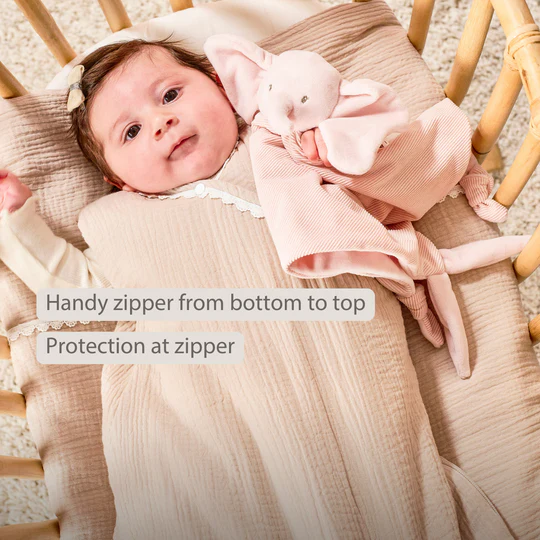Çanta e gjumit Nattou 60 cm me mëngë dhe doreza i jep fëmijës suaj një ndjesi të butë dhe të sigurt gjatë gjumit. Pjesa e jashtme ultra e butë prej kadifeje dhe rreshtimi prej pambuku ofrojnë ngrohtësi të këndshme dhe qarkullim optimal të ajrit. Falë zinxhirit të përshtatshëm që hapet nga poshtë lart, ndërrimet e rrobave gjatë natës bëhen shumë më të lehta. Me përshtatjen e saj të rehatshme dhe prerjen e lirshme, i vogli juaj mund të lëvizë lirshëm, ndërsa dorezat ofrojnë rehati shtesë. Përveç kësaj, çanta e gjumit është e pajisur me një hapje për rripa, duke e bërë të sigurt për t'u përdorur edhe në sediljen e makinës. Një zgjedhje praktike dhe komode për të porsalindurit deri në rreth 3 deri në 4 muaj.